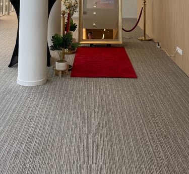 Décoration soignée : tapis rouge, potelets et plantes décoratives